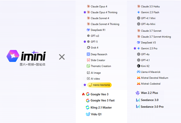在视频领域,iMini AI同步整合了Google的Veo3Fast与国内自主研发的Vidu Q1模型,构建起功能互补的生态系统。