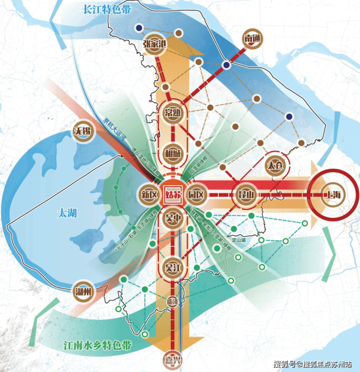 纵观苏州过去20年的发展历程,其主要依托东西向的沪宁发展轴为城市主动脉发展。然而,随着城市的发展,东西向的沪宁发展轴已经处于饱和状态,苏州目前的发展重点正在向南北向的通苏嘉甬发展轴拓展,以寻求新的发展空间。这一战略转变,为相城区带来了前所未有的发展机遇。