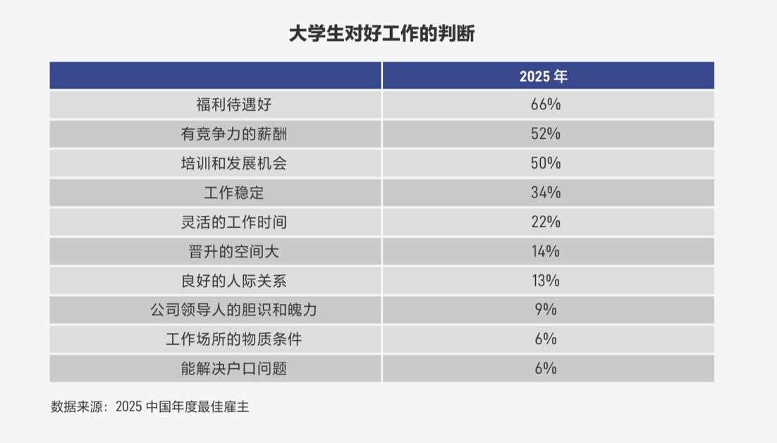 特别是对于即将步入社会的大学生而言,“好工作”的定义非常朴实:66%的人首选“福利待遇好”,52%的人看重“有竞争力的薪酬”,50%的人看重“培训和发展机会”,关注“公司领导人的胆识和魄力”的仅占9%。