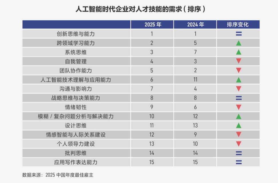 企业对人才的核心技能需求也因此产生了极大改变。在2025年企业对人才技能的需求排序中,“创新思维与能力”稳居榜首,“跨领域学习能力”和“系统思维”分列第2、3位,相比往年排名均大幅提升。说明在AI时代,企业越来越倾向于具备创新思维、跨领域学习、系统思维等能力的复合型人才,以适应AI带来的产业变革。如果你还在打磨单一的重复性技能,是时候警醒了。
